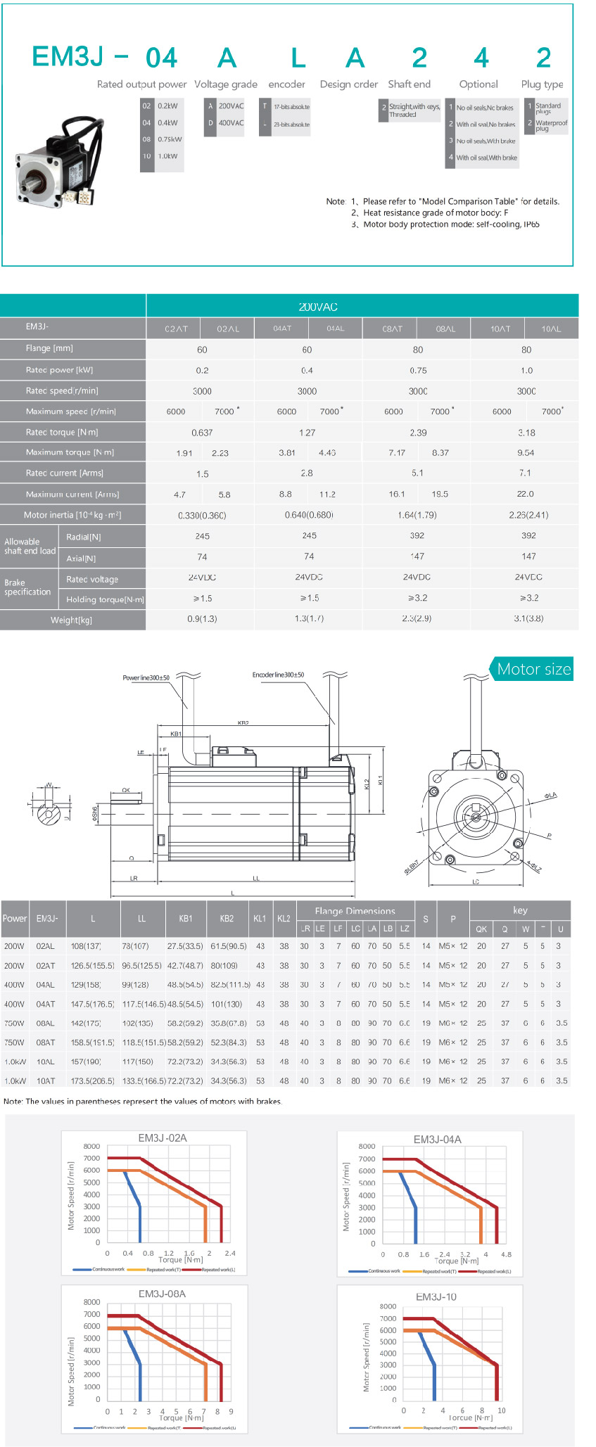 EM3J, genellikle redüktör veya kayış bağlantısı kullanarak, 200W~1000W güç sağlayarak, robotlar, her türlü genel amaçlı ekipman ve diğer genel çalışma durumları için hız, konumlandırma kararlılığı gereksinimlerindeki genel mekanik sertlik durumlarını karşılamak üzere orta ve yüksek hız, büyük yük ataleti uygulamaları için tasarlanmıştır.
